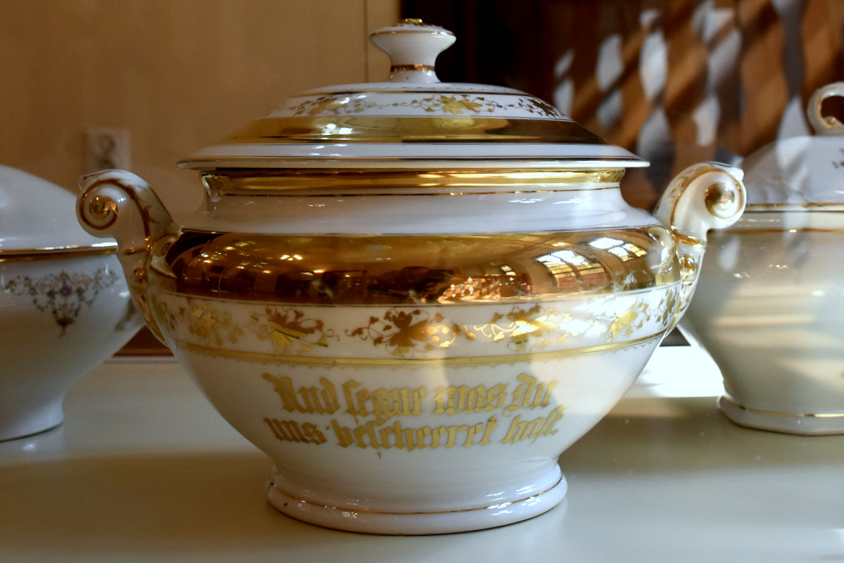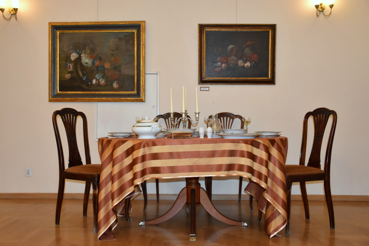 Piętro oficyny naszego muzeum wypełniła ceramika, szkło, elementy metalowej zastawy stołowej, bielizna stołowa, meble oraz inne muzealia związane z kulturą ucztowania, picia kawy, herbaty, przygotowania oraz serwowania posiłków. Pochodzące z naszych zbiorów eksponaty wywodzą się z różnych okresów (XVIII – XX wiek) oraz krajów (od Polski, Niemiec po Anglię i inne kraje Europy), reprezentują różnorodne style (rokoko, eklektyzm, secesja, art deco i inne) oraz materiały (srebro, porcelana, szkło, tkanina żakardowa i inne) i zastosowanie. Wśród kilkudziesięciu obiektów znajdują się także śląskie wyroby rzemiosła artystycznego, w tym porcelana z historycznych wytwórni w Wałbrzychu i Jaworzynie Śląskiej, serwety ze śląskich tkalni, oraz lokalne elementy zastawy stołowej. Wystawę w części aranżacji uzupełniają obrazy: martwa natura oraz sceny rodzajowe. Na ekspozycji znaleźć można wiele intrygujących i mniej znanych przedmiotów związanych z kulturą stołu, jak filiżanki wąsacza czy manche à gigot – czyli uchwyt do kości pieczonej jagnięciny. Zapraszamy do odkrywania naszej nowej ekspozycji.