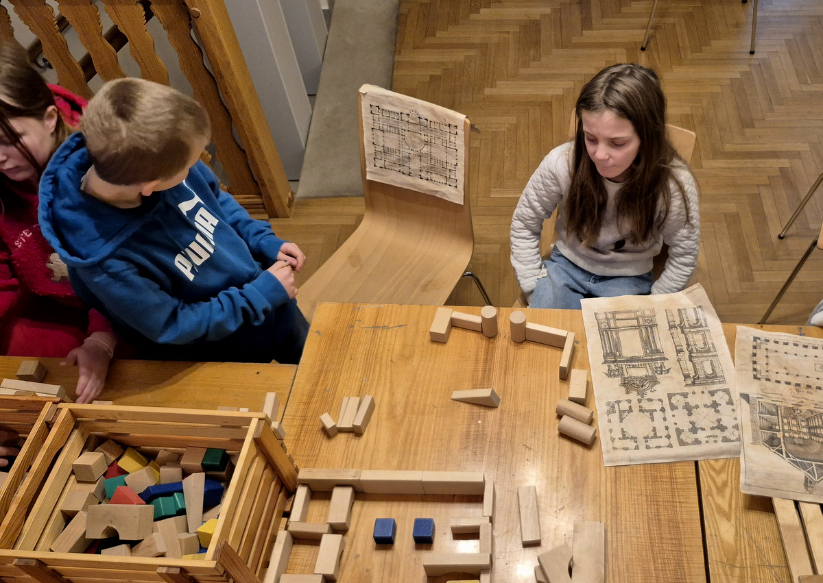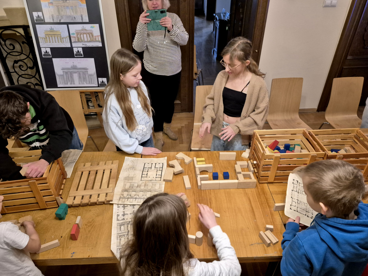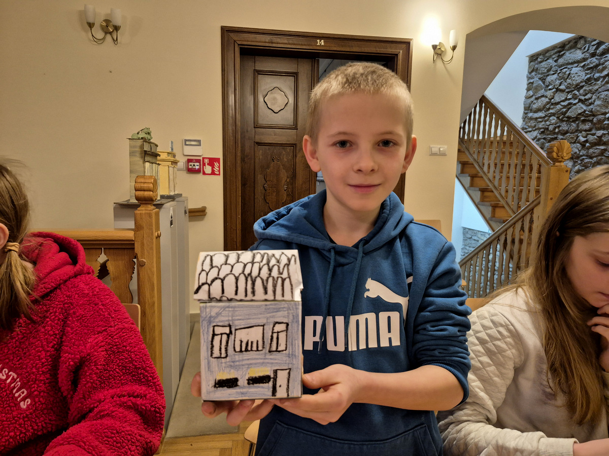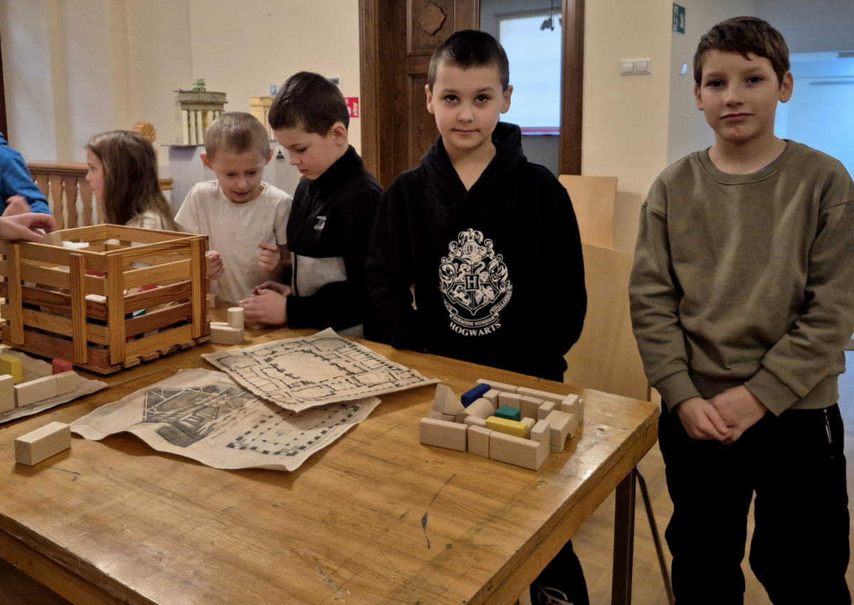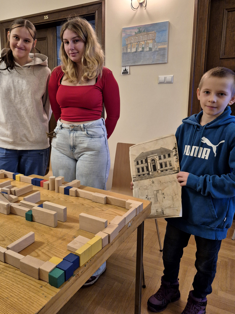 Podczas zajęć uczestnicy wzięli udział w pogadance na temat tego, czym jest architektura, na czym polega praca architekta, jakich narzędzi używano podczas tworzenia projektów architektonicznych oraz jakimi klasycznymi zasadami kierowali się twórcy budowli. Po kreatywnej „burzy mózgów” przyszła kolej na zajęcia praktyczne. Pierwszym ćwiczeniem było wznoszenie z klocków drewnianych fundamentów budynków na podstawie wydruków historycznych projektów z rzutami poziomymi rozmaitych budowli. Nasi młodzi goście poradzili sobie z tym zadaniem świetnie. Powstały zarysy pałaców, kościołów czy domów mieszkalnych. Kolejnym zadaniem było przygotowanie projektu fasady budynku i zaprezentowanie go jako modelu architektonicznego. Do tego ćwiczenia wykorzystane zostały kartony z makulatury oraz kartki z namalowanymi projektami elewacji.