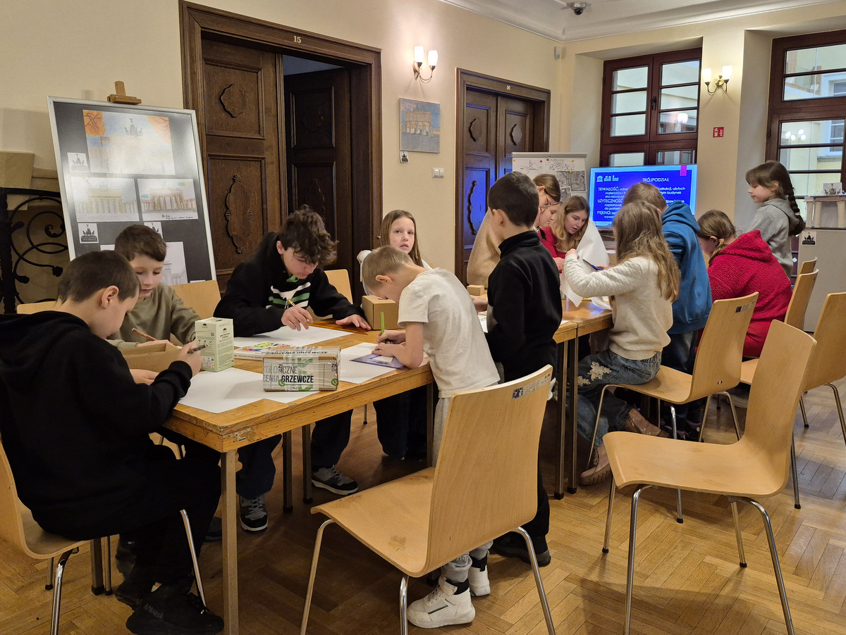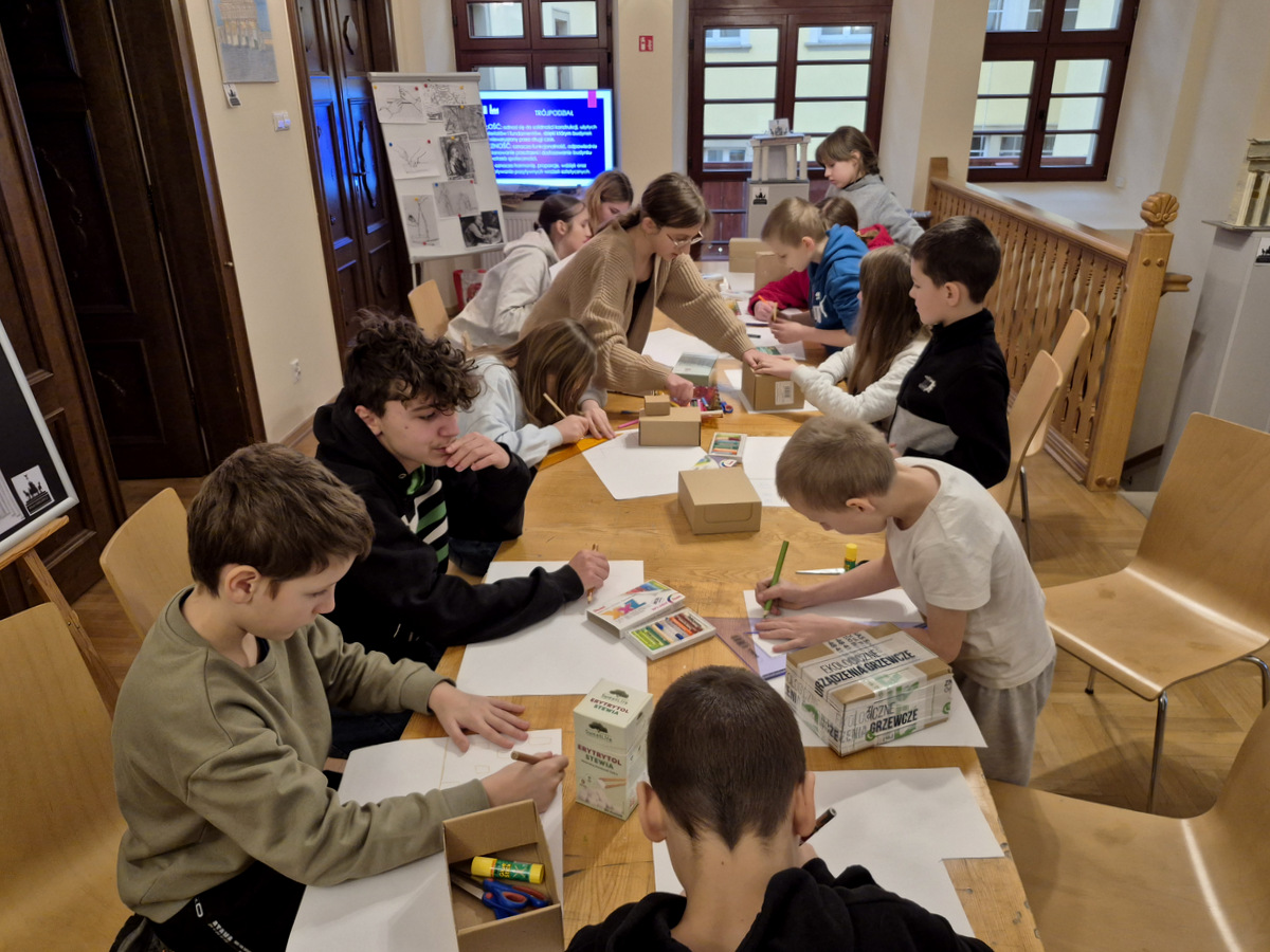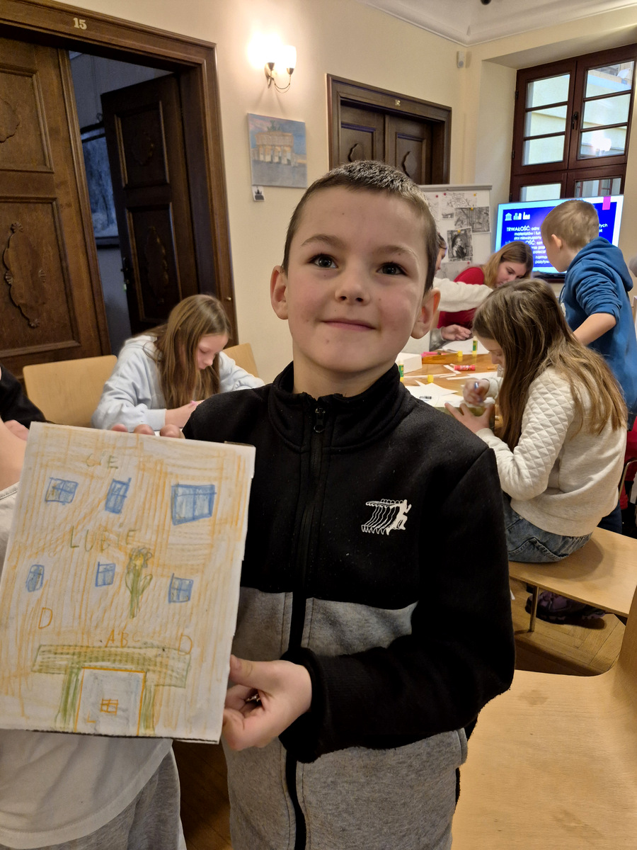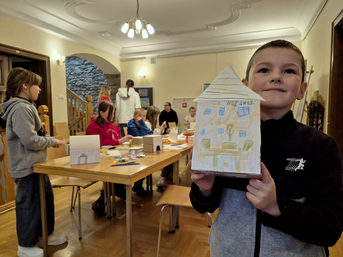 Podczas zajęć uczestnicy wzięli udział w pogadance na temat tego, czym jest architektura, na czym polega praca architekta, jakich narzędzi używano podczas tworzenia projektów architektonicznych oraz jakimi klasycznymi zasadami kierowali się twórcy budowli. Po kreatywnej „burzy mózgów” przyszła kolej na zajęcia praktyczne. Pierwszym ćwiczeniem było wznoszenie z klocków drewnianych fundamentów budynków na podstawie wydruków historycznych projektów z rzutami poziomymi rozmaitych budowli. Nasi młodzi goście poradzili sobie z tym zadaniem świetnie. Powstały zarysy pałaców, kościołów czy domów mieszkalnych. Kolejnym zadaniem było przygotowanie projektu fasady budynku i zaprezentowanie go jako modelu architektonicznego. Do tego ćwiczenia wykorzystane zostały kartony z makulatury oraz kartki z namalowanymi projektami elewacji.