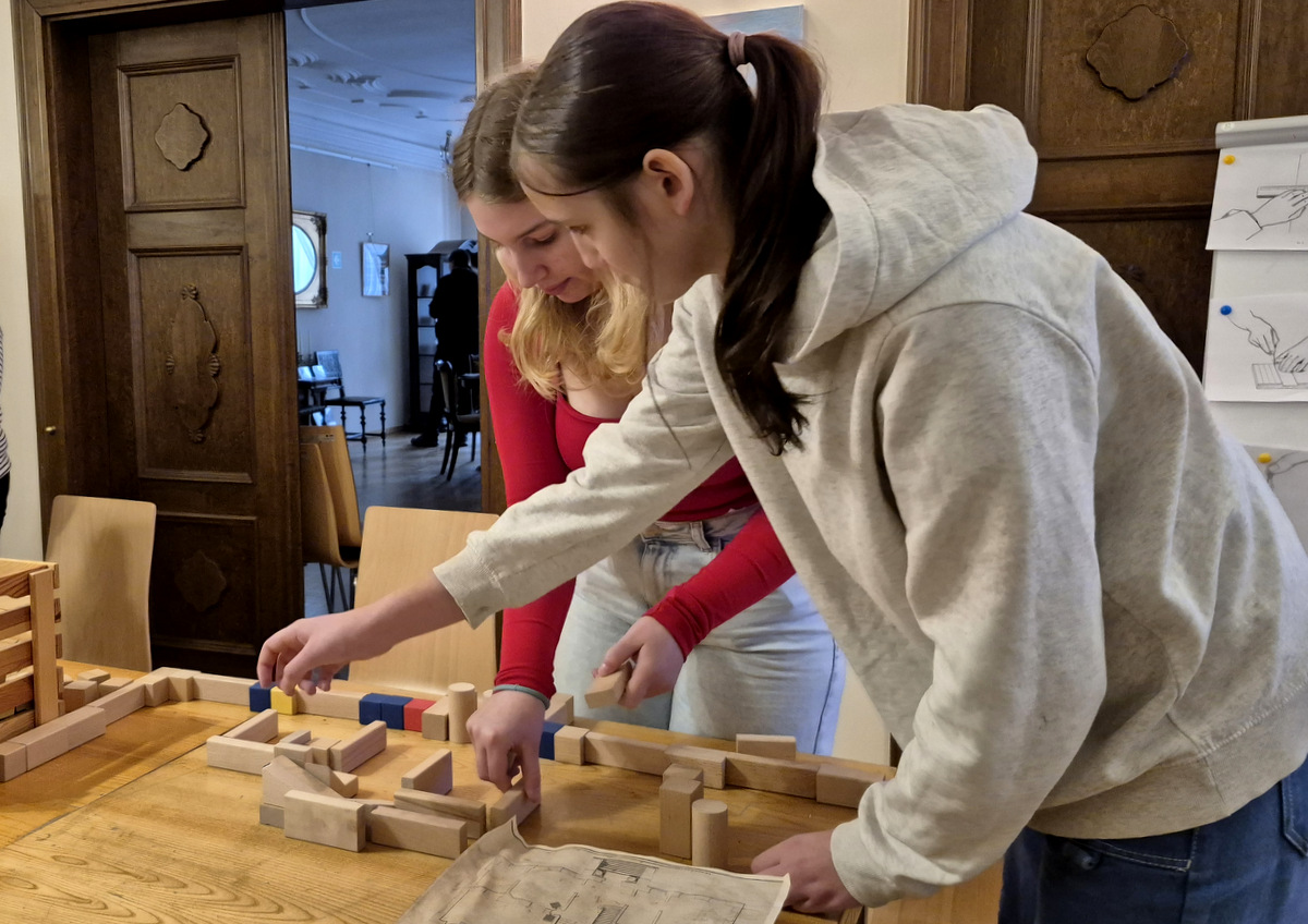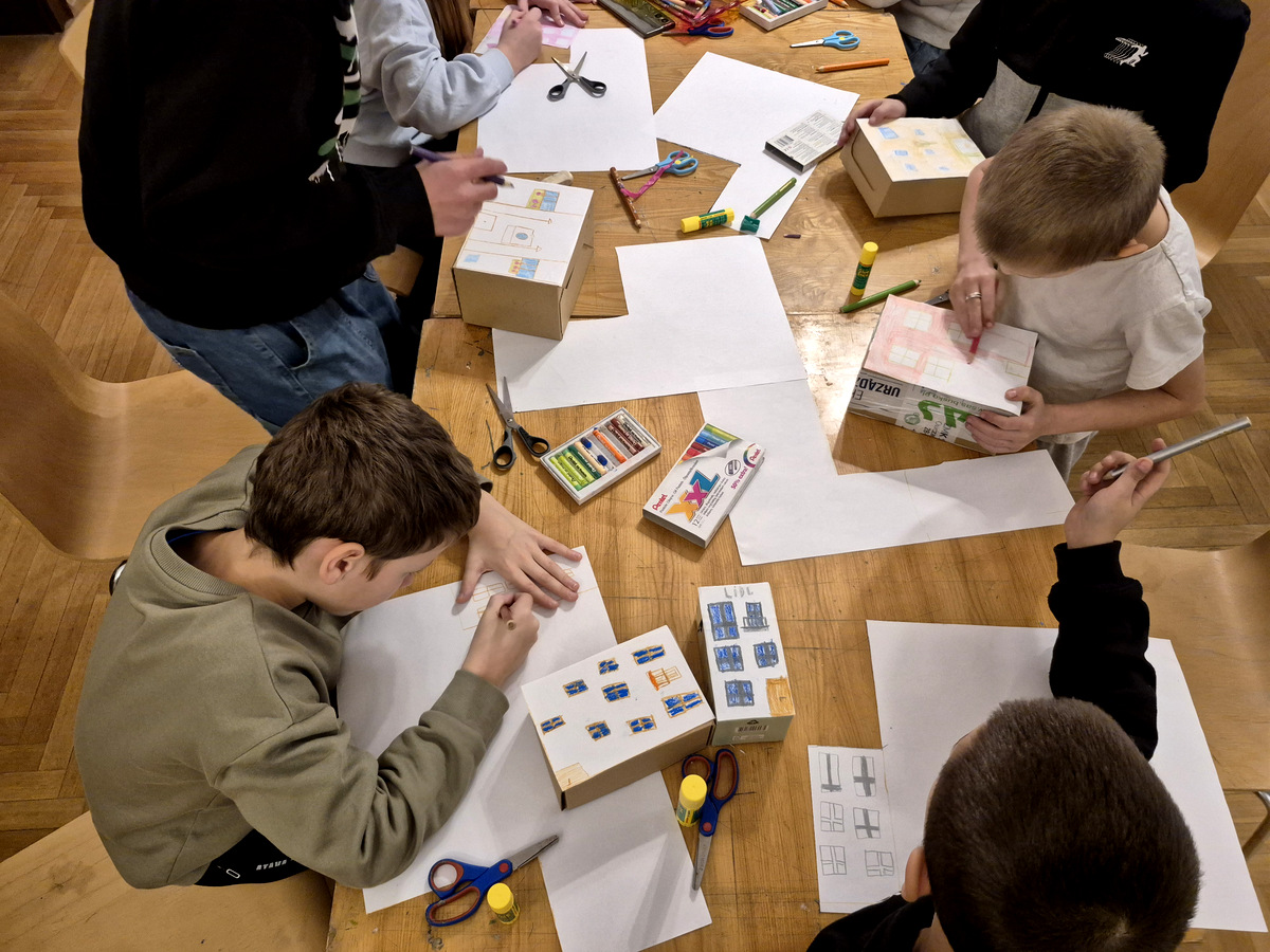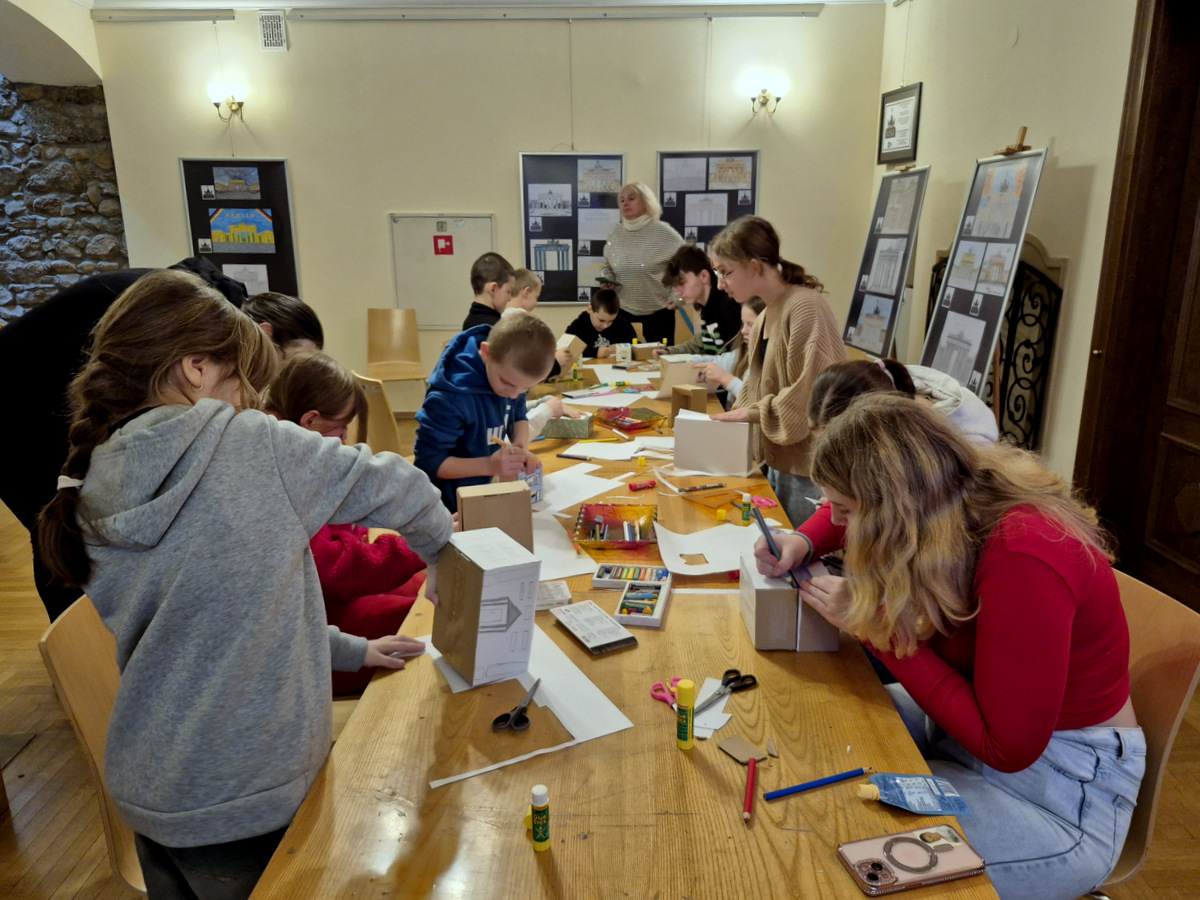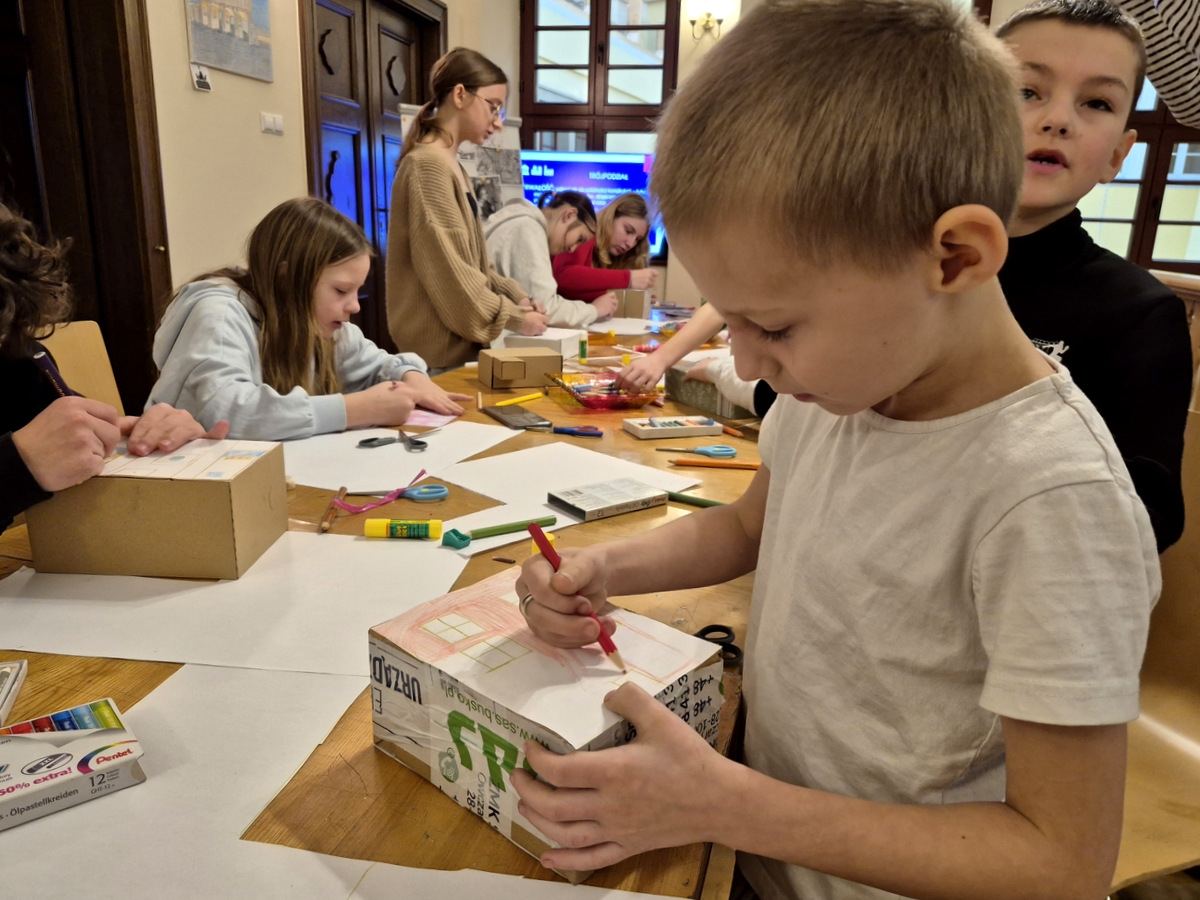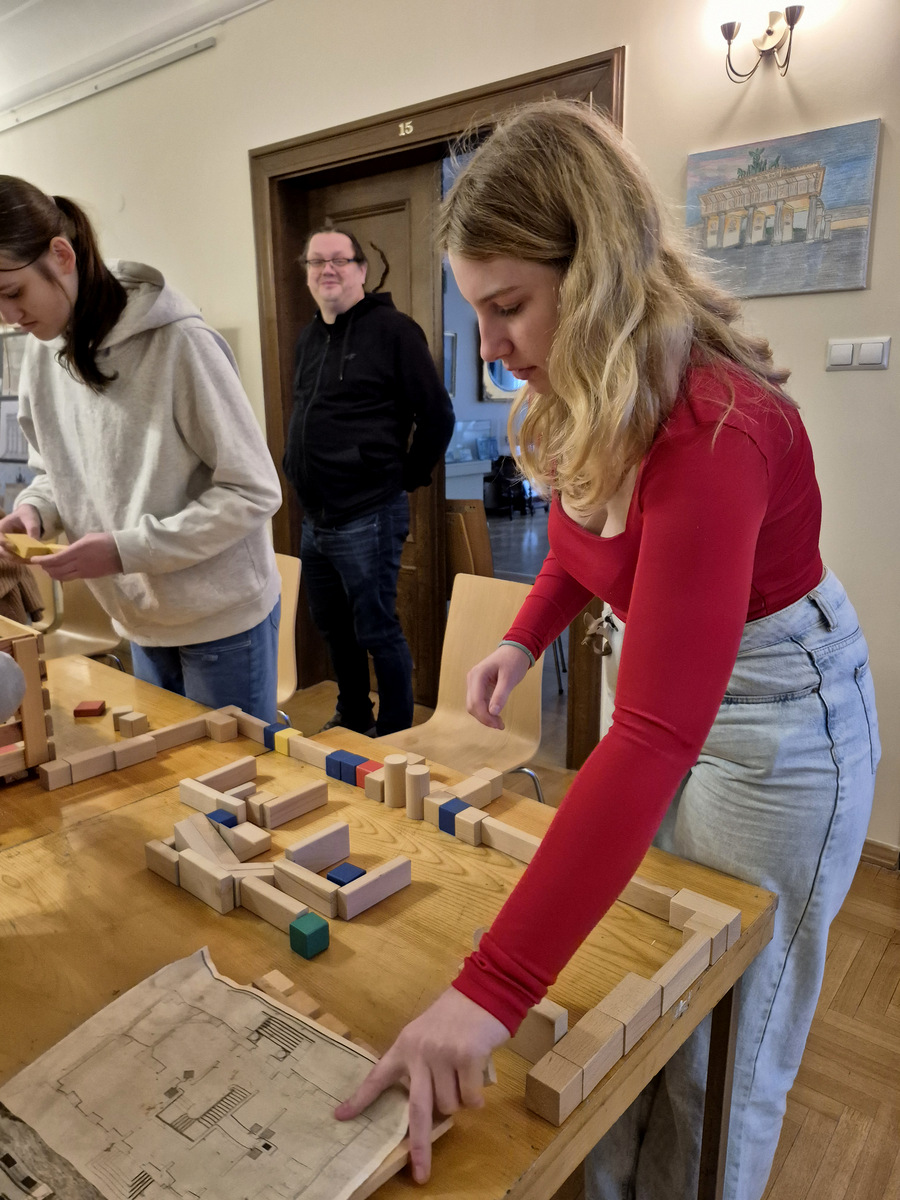 Podczas zajęć uczestnicy wzięli udział w pogadance na temat tego, czym jest architektura, na czym polega praca architekta, jakich narzędzi używano podczas tworzenia projektów architektonicznych oraz jakimi klasycznymi zasadami kierowali się twórcy budowli. Po kreatywnej „burzy mózgów” przyszła kolej na zajęcia praktyczne. Pierwszym ćwiczeniem było wznoszenie z klocków drewnianych fundamentów budynków na podstawie wydruków historycznych projektów z rzutami poziomymi rozmaitych budowli. Nasi młodzi goście poradzili sobie z tym zadaniem świetnie. Powstały zarysy pałaców, kościołów czy domów mieszkalnych. Kolejnym zadaniem było przygotowanie projektu fasady budynku i zaprezentowanie go jako modelu architektonicznego. Do tego ćwiczenia wykorzystane zostały kartony z makulatury oraz kartki z namalowanymi projektami elewacji.