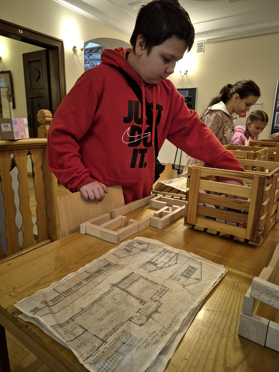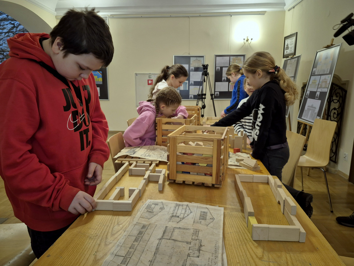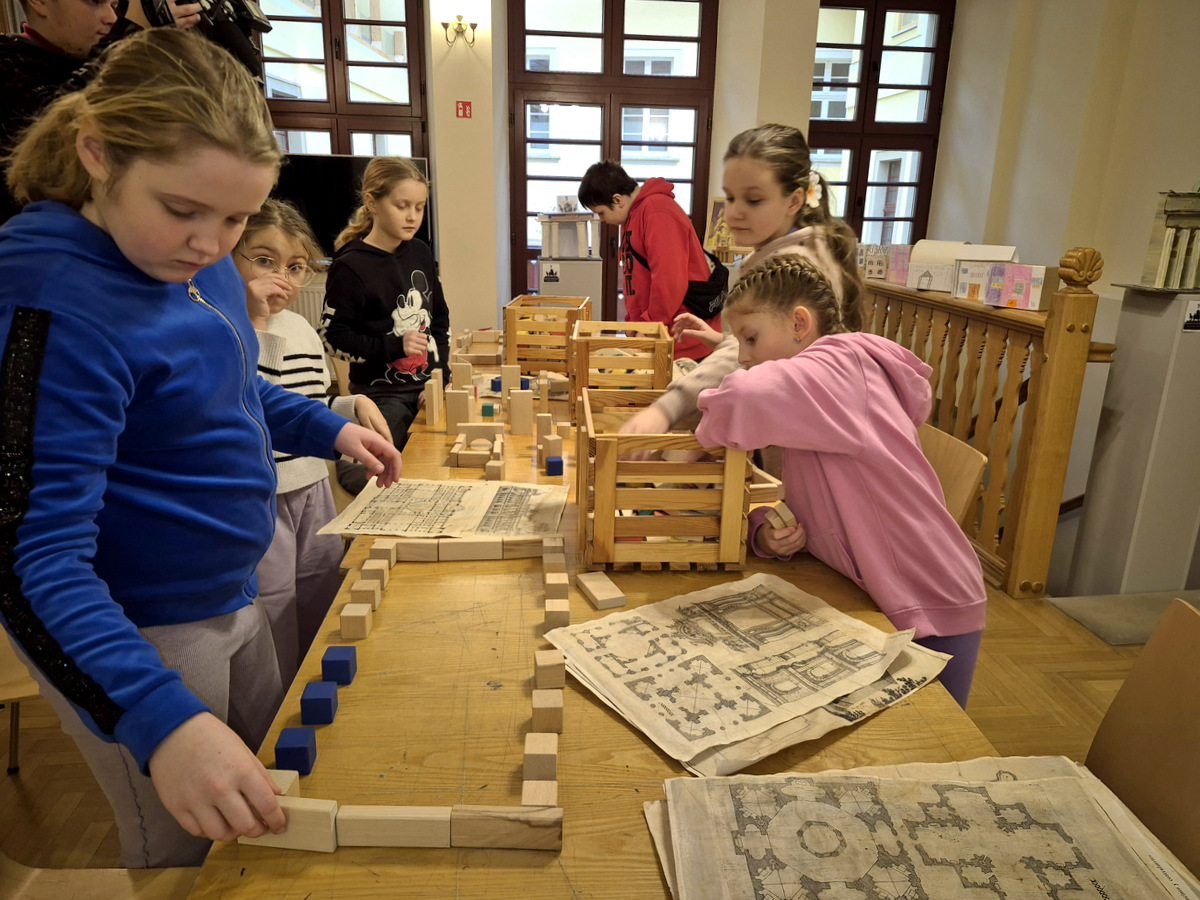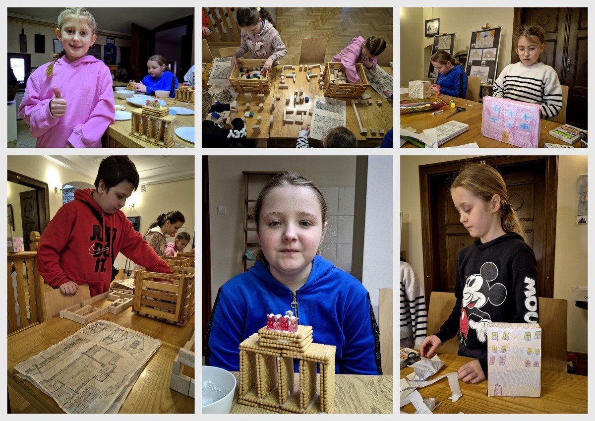Po małym przeszkoleniu teoretycznym, przyszła kolej na zajęcia praktyczne! Pierwszym ćwiczeniem było wznoszenie z drewnianych klocków edukacyjnych symbolicznych fundamentów budynków. Dzieci budowały je, wzorując się na autentycznych projektach architektonicznych! W tym zadaniu korzystaliśmy z wydruków historycznych projektów z rzutami poziomymi rozmaitych budowli. Nasi młodzi goście poradzili sobie z tym zadaniem rewelacyjnie!