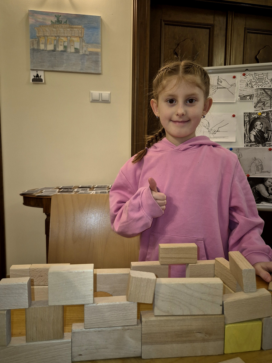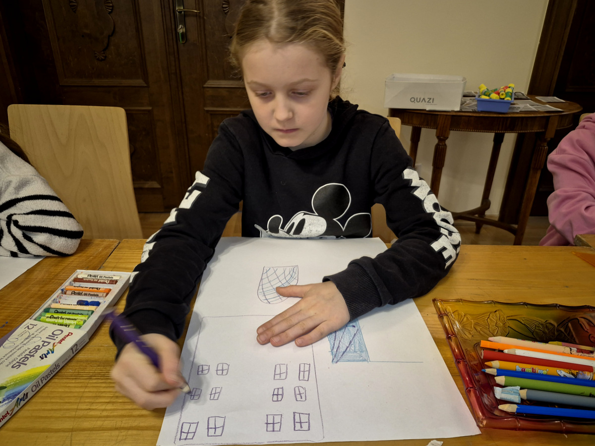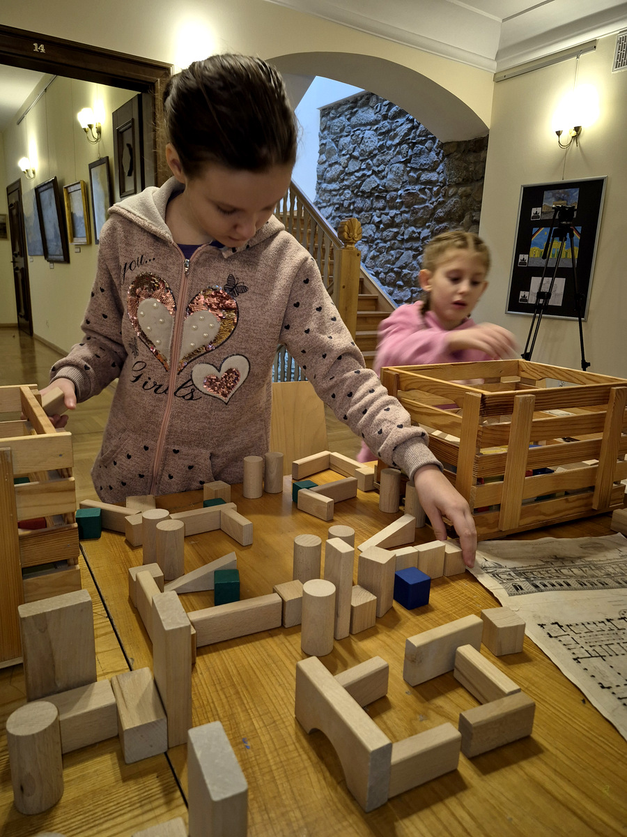 Po małym przeszkoleniu teoretycznym, przyszła kolej na zajęcia praktyczne! Pierwszym ćwiczeniem było wznoszenie z drewnianych klocków edukacyjnych symbolicznych fundamentów budynków. Dzieci budowały je, wzorując się na autentycznych projektach architektonicznych! W tym zadaniu korzystaliśmy z wydruków historycznych projektów z rzutami poziomymi rozmaitych budowli. Nasi młodzi goście poradzili sobie z tym zadaniem rewelacyjnie!