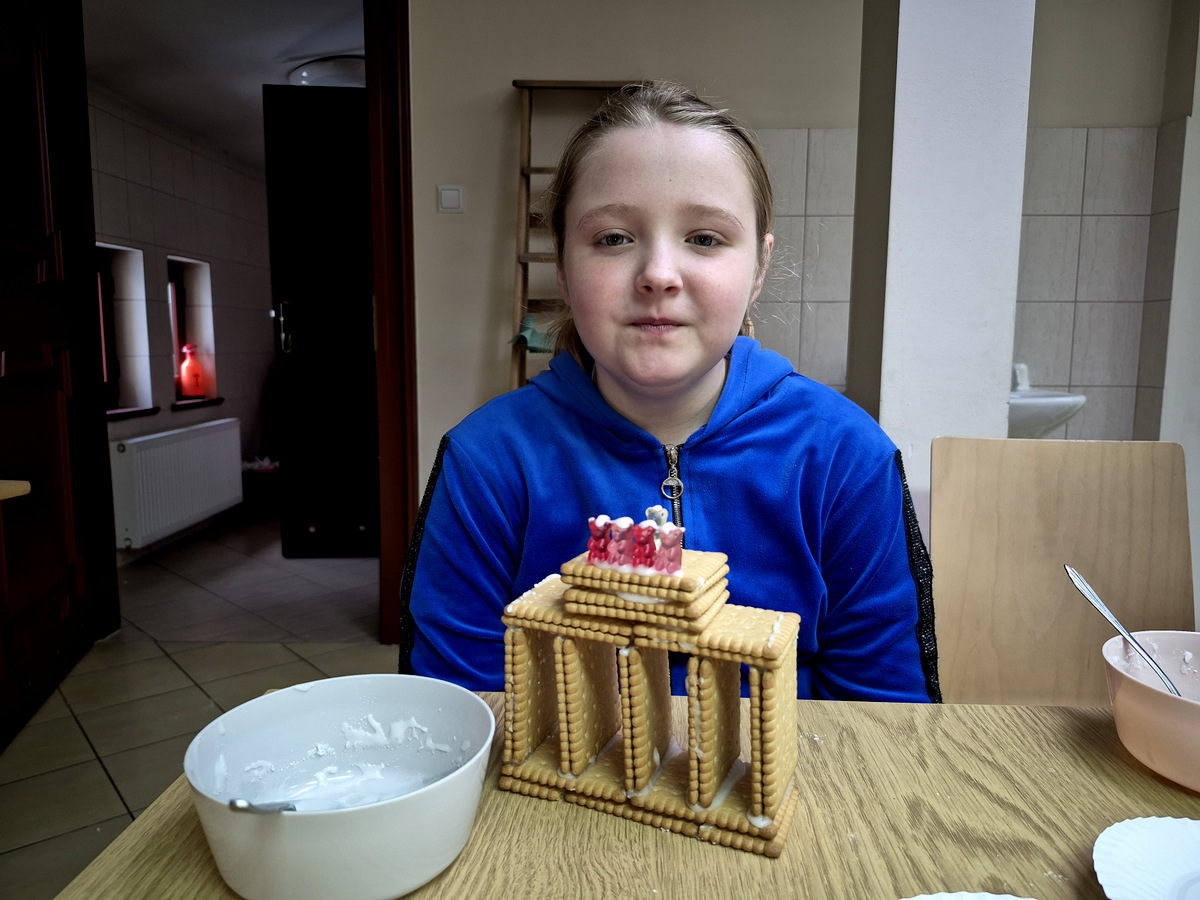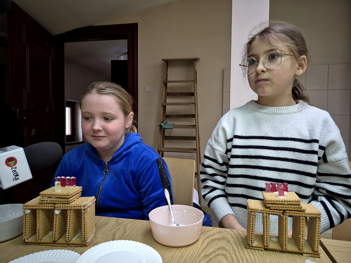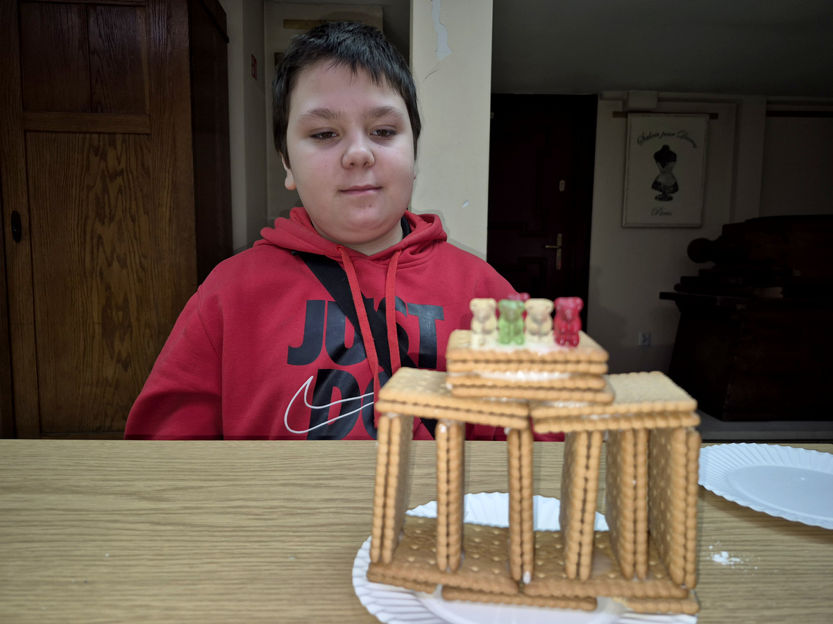 Ostatnim, finałowym zadaniem było budowanie słodkiej makiety! Jako wzorzec wybrana została wspominana Brama Brandenburska w Berlinie, dzieło Carla Gottharda Langhansa. Nasi mali goście zbudowali własną bramę, wykorzystując jako materiały… herbatniki (budulec), lukier (spoiwo) oraz żelki (dekoracje). Deserowy model słynnego zabytku był sporym wyzwaniem, z którym nasi goście poradzili sobie doskonale!