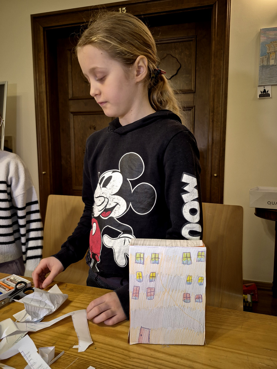 Kolejnym etapem architektonicznej edukacji było przygotowanie projektu elewacji dowolnego budynku i zaprezentowanie go jako modelu architektonicznego. Do tego ćwiczenia wykorzystane zostały kartony z makulatury oraz kartki z autorskimi namalowanymi projektami. Młodzi adepci i adeptki architektury stworzyli ciekawe, funkcjonalne i kolorowe projekty domów rodzinnych i wielorodzinnych.