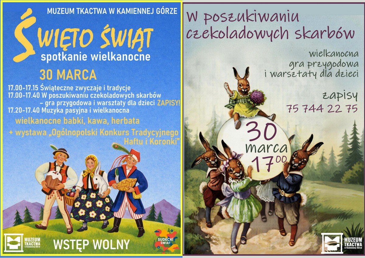 Muzeum Tkactwa w Kamiennej Górze zaprasza na familijne wydarzenie „Święto Świąt”. W poniedziałek 30 marca odbędą się gry i warsztaty dla najmłodszych oraz wykłady dla dorosłych. Dodatkową atrakcją będzie poczęstunek, a także możliwość zobaczenia wystawy tradycyjnych haftów i koronek oraz zabytków związanych z Wielkanocą.